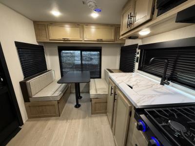 Convenient camping is found with this lightweight travel trailer! Once you arrive at your destination, put out the 15' power awning, then make lunch on the exterior mini kitchen. Inside, you can dine at the booth dinette, freshen up in the tub/shower, and sleep soundly on the queen bed in the master bedroom. And you're sure to find plenty of storage spaces both inside and outside.